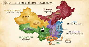 C'est pourquoi, sur AsiaOnTheWay, nous avons conçu une approche unique et simplifiée pour vous guider à travers ce géant asiatique. Plutôt que de vous noyer sous un flot d'informations, nous avons découpé la Chine en six régions distinctes, chacune avec son propre caractère, ses paysages emblématiques et ses trésors cachés.