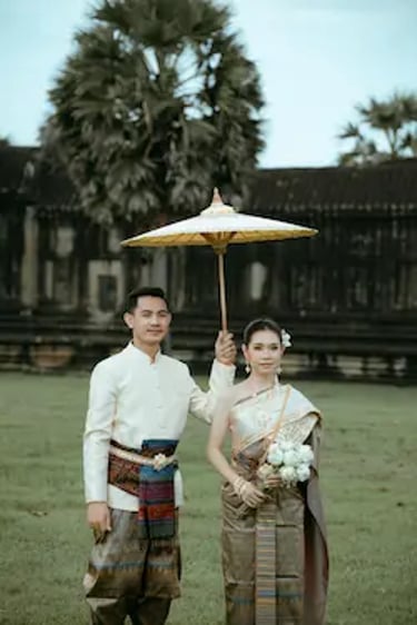 It embodies Cambodian pride and refinement. Fabrics, often silk or richly embroidered, express prestige and tradition, especially during weddings or Apsara dance performances inherited from Angkor temples.